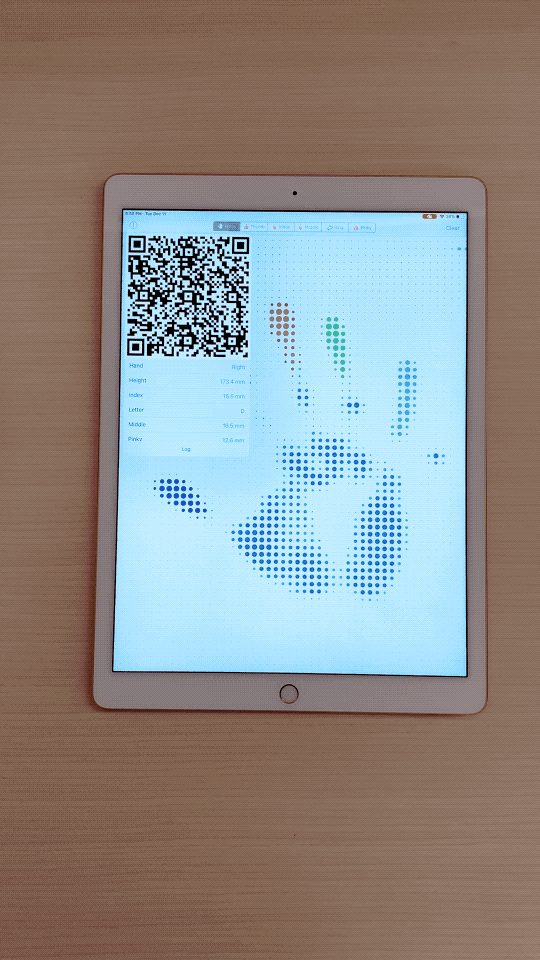 For Apple’s Weeks of Code (internal two-week hackathon), my colleagues Goutham Mani, James Magahern, and I developed Handprint, an app to quickly collect hand measurements during user studies. Simply place your hand on iPad’s screen. Each finger’s width is captured on a separate canvas to improve accuracy. Measurements can be viewed right in the app or transferred to another app by scanning the QR code encoding these data.